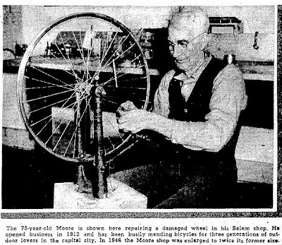 Longest trip Mr. Moore ever made on a bike was from Salem to Castle Rock, Wash., and back...[sic] in the day when there was no highway. Pedaling alongside the railroad tracks, the bicycle expert made the journey in three days each way. It was then he made up his mind the bicycle had a great future!